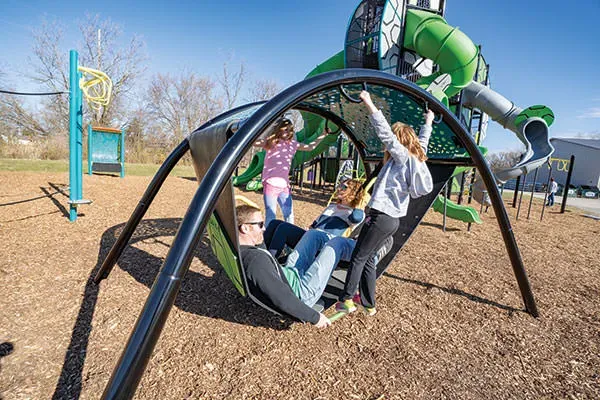- Volito Swing: Kids love swinging almost as much as peanut butter and jelly sandwiches! This swing can accommodate multiple children, including those with mobility devices. It's a great way for kids to socialize and have fun together, regardless of their abilities. As an added bonus, you can double up with a second Volito or even connect an AirVenture® Glider in a double swing bay to add versatility to your play structure.